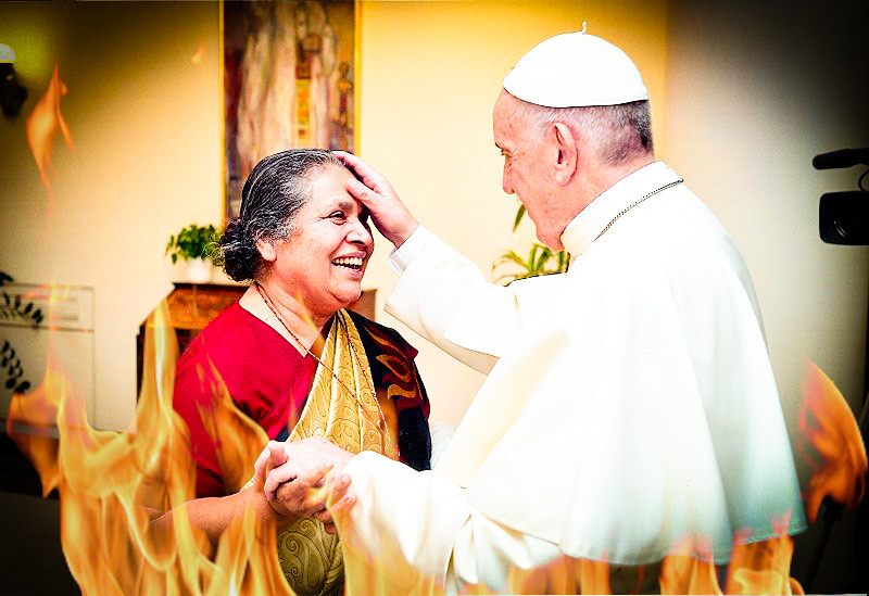 Os dois métodos mais frequentemente empregados por aqueles que tentam defender a seita do Vaticano II como sendo a Igreja Católica Romana são os seguintes: (1) deturpar o Magistério para que se possa escolher quais ensinamentos de Bergoglio se quer seguir e quais se quer ignorar (o favorito dos “Reconhecer e resistir”, também conhecidos como “R&R”), ou (2) rejeitar a heresia e “fazê-la desaparecer” pela “hermenêutica da continuidade” (a ilusão preferida dos apologistas da seita do Vaticano II). Veremos como é impossível fazer isso funcionar. A imagem acima é uma foto de Bergoglio com a “Sra.” Lucy Kurien, a fundadora da “Maher”, uma organização inter-religiosa na Índia dedicada a ajudar mulheres e crianças carentes e vítimas de abuso.